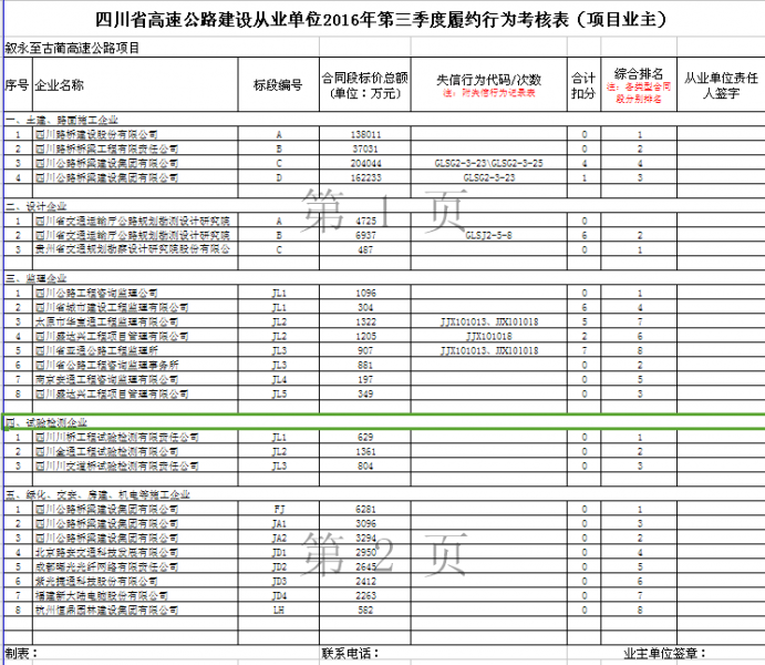 四川省高速公路建設(shè)從業(yè)單位2016年第三季度履約行為考核表(項(xiàng)目業(yè)主)