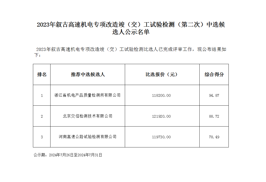 2023年敘古高速機(jī)電專項(xiàng)改造竣(交)工試驗(yàn)檢測(第二次)中選候選人公示名單