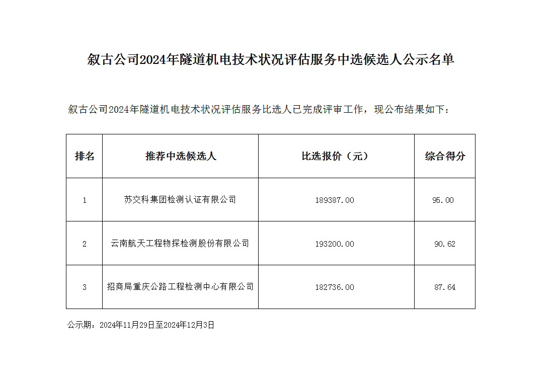 敘古公司2024年隧道機電技術(shù)狀況評估服務中選候選人公示名單