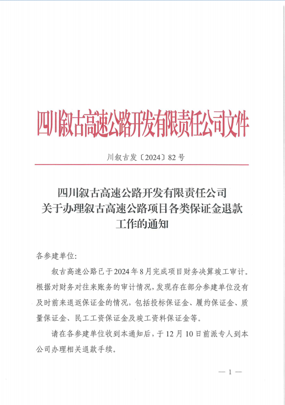 敘古公司關于辦理敘古高速公路項目各類保證金退款工作的通知