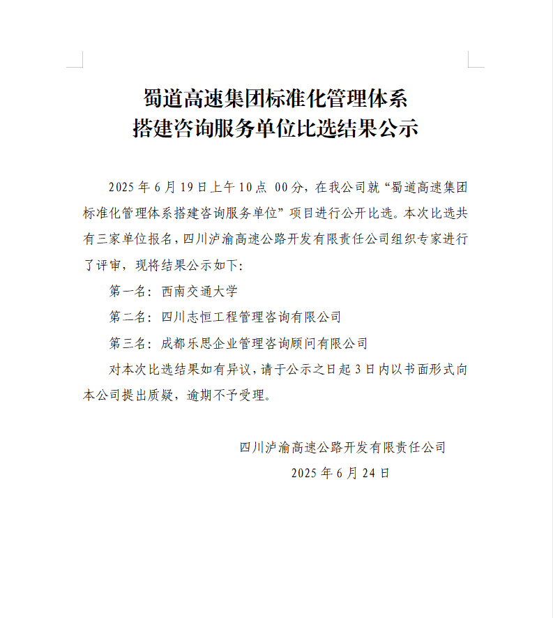 蜀道高速集團(tuán)標(biāo)準(zhǔn)化管理體系搭建咨詢服務(wù)單位比選結(jié)果公示